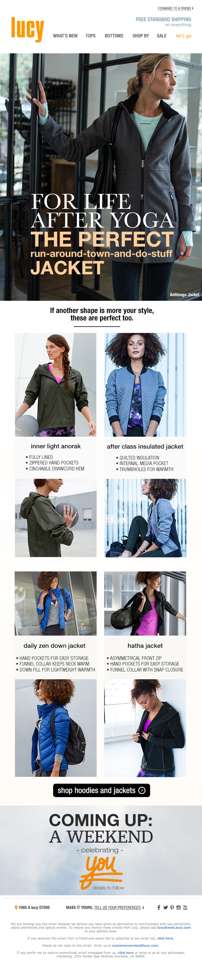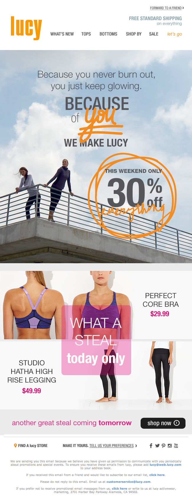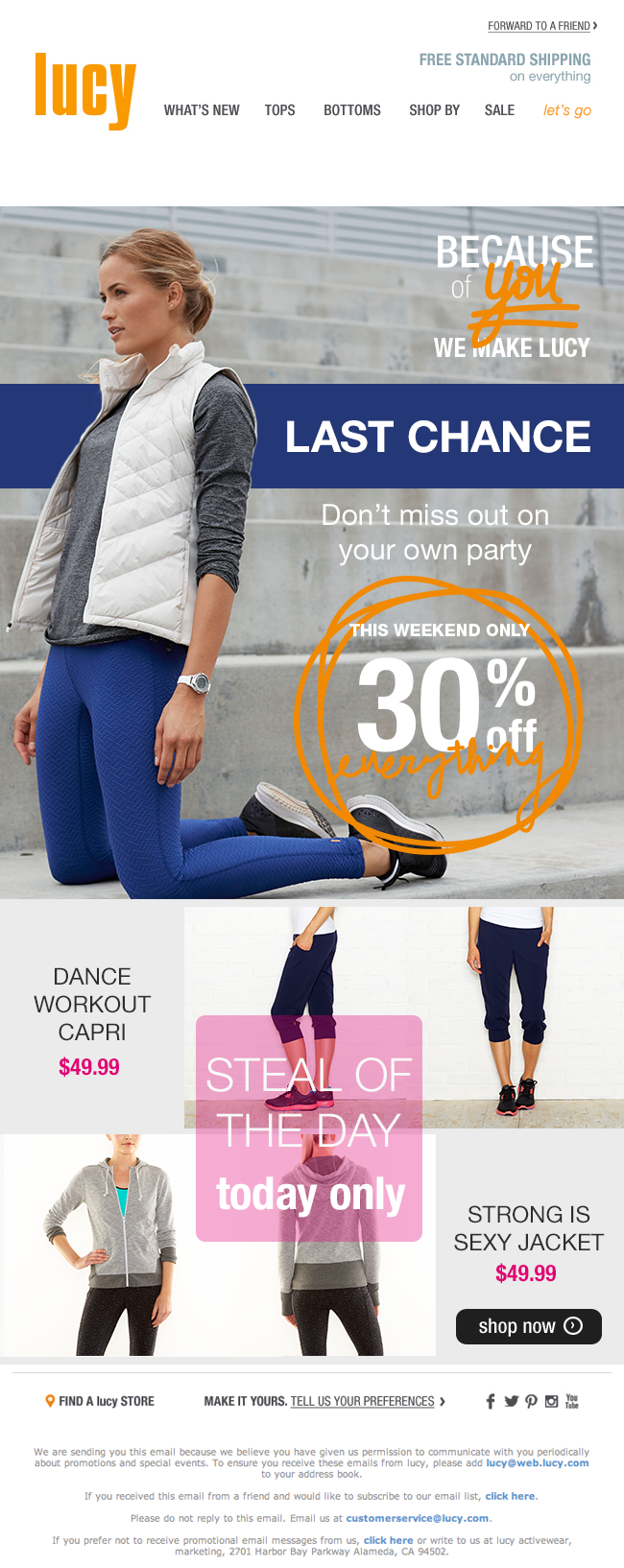 Digital (and some Print) Marketing assets created for Lucy Activewear. Used for Lucy's company website, subscriber emails, in-store signage, in-store promo cards/mailers, & social media accounts.